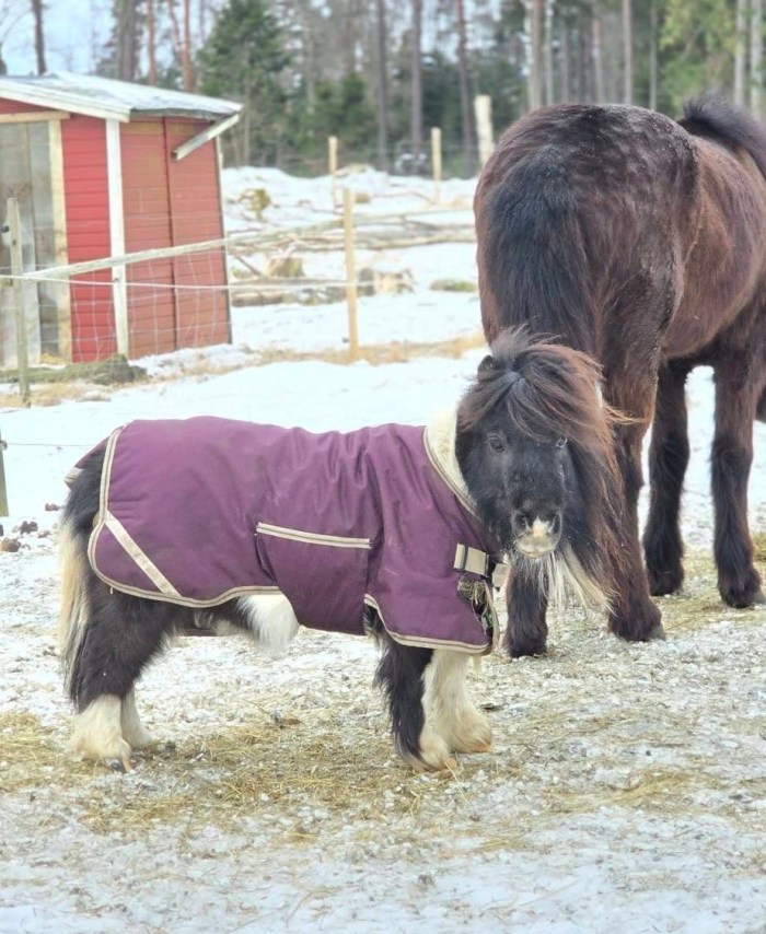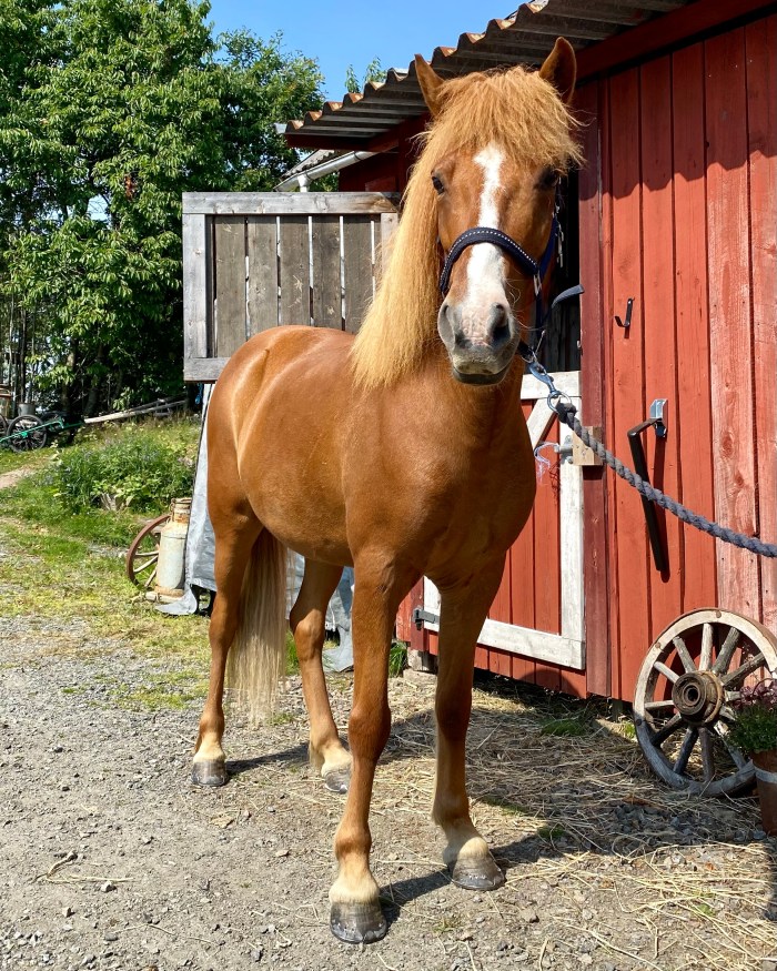 Russin är av rasen mini shetlandsponny och gårdens maskot. Hon är endast 70 cm hög, och såklart söt som socker!